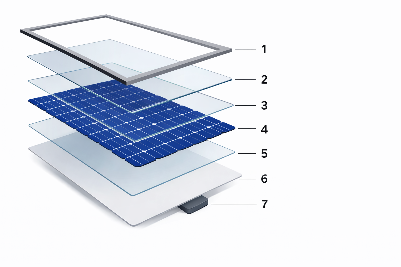 The front glass provides most of the module’s mechanical protection and ensures high light transmission. It is typically tempered solar glass and represents the largest mass share of the module.